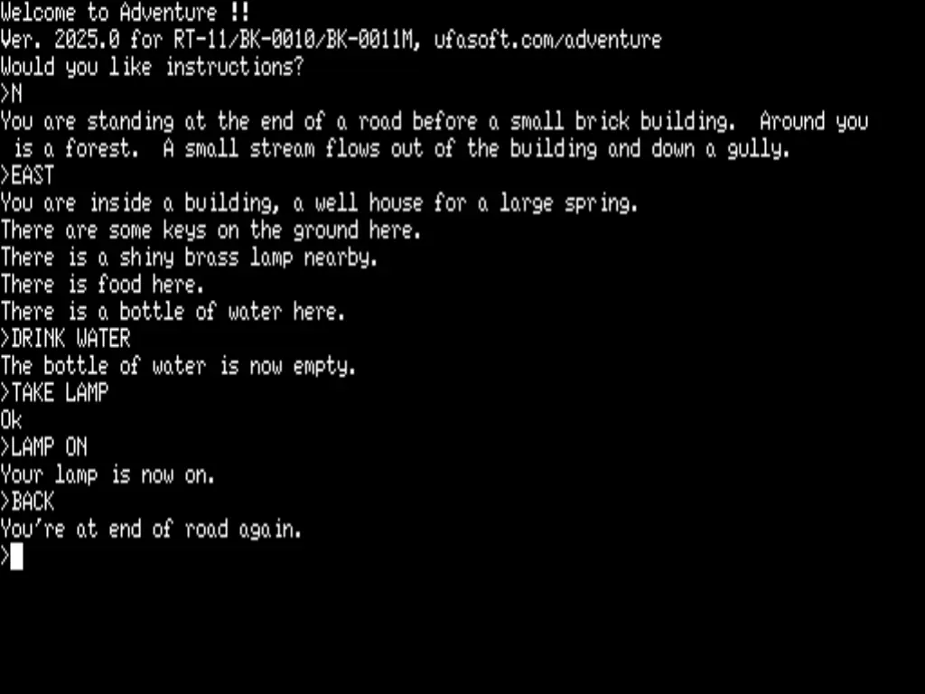 You are standing at the end of a road before a small brick building. Around you is a forest. A small stream flows out of the building and down a gully. >EAST You are inside a building, a well house for a large spring. There are some keys on the ground here. There is a shiny brass lamp nearby. There is food here. There is a bottle of water here. >TAKE LAMP Ok >TAKE KEYS Ok >BACK You're at end of road again. >D You are in a valley in the forest beside a stream tumbling along a rocky bed. >S At your feet all the water of the stream splashes into a 2-inch slit in the rock . Downstream the streambed is bare rock. >DNSTR You are in a 20-foot depression floored with bare dirt. Set into the dirt is a strong steel grate mounted in concrete. A dry streambed leads into the depressi on. The grate is locked. >OPEN GRATE